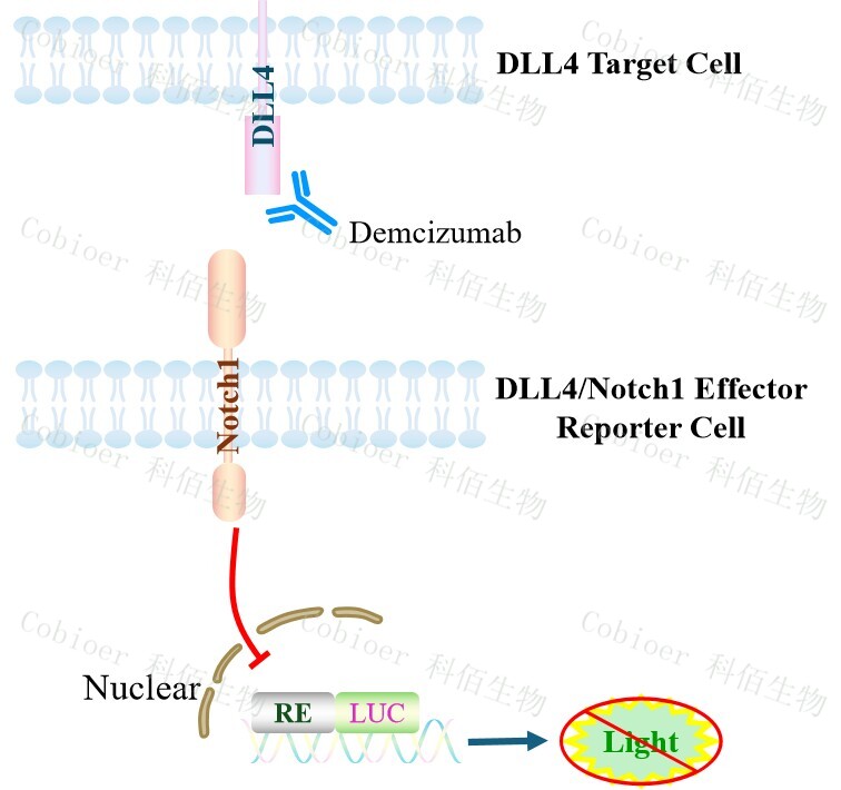 DLL4/Notch1 Effector Reporter Cell 報告基因藥靶模型很好的模擬了體內 DLL4/Notch1 的信號轉導過(guò)程,原理見(jiàn)下圖所示。