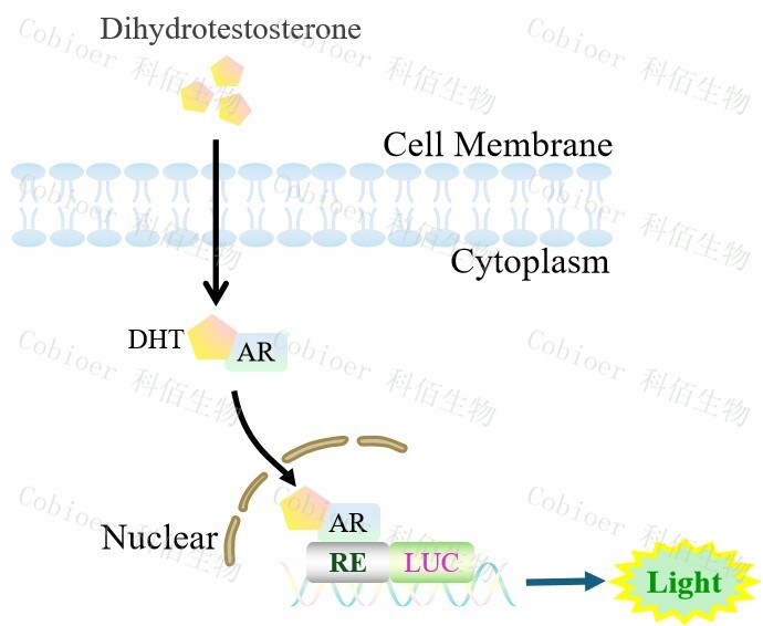 AR Reporter LNCAP Cell(DHT high sensitive)藥靶細胞,在由調控因子調 控并表達報告基因的重組細胞上,穩定表達人 AR。雄激素的代謝產(chǎn)物 DHT(雙氫睪酮) 會(huì )與細胞上的 AR 結合,激活 AR 信號通路,原理見(jiàn)下圖所示。