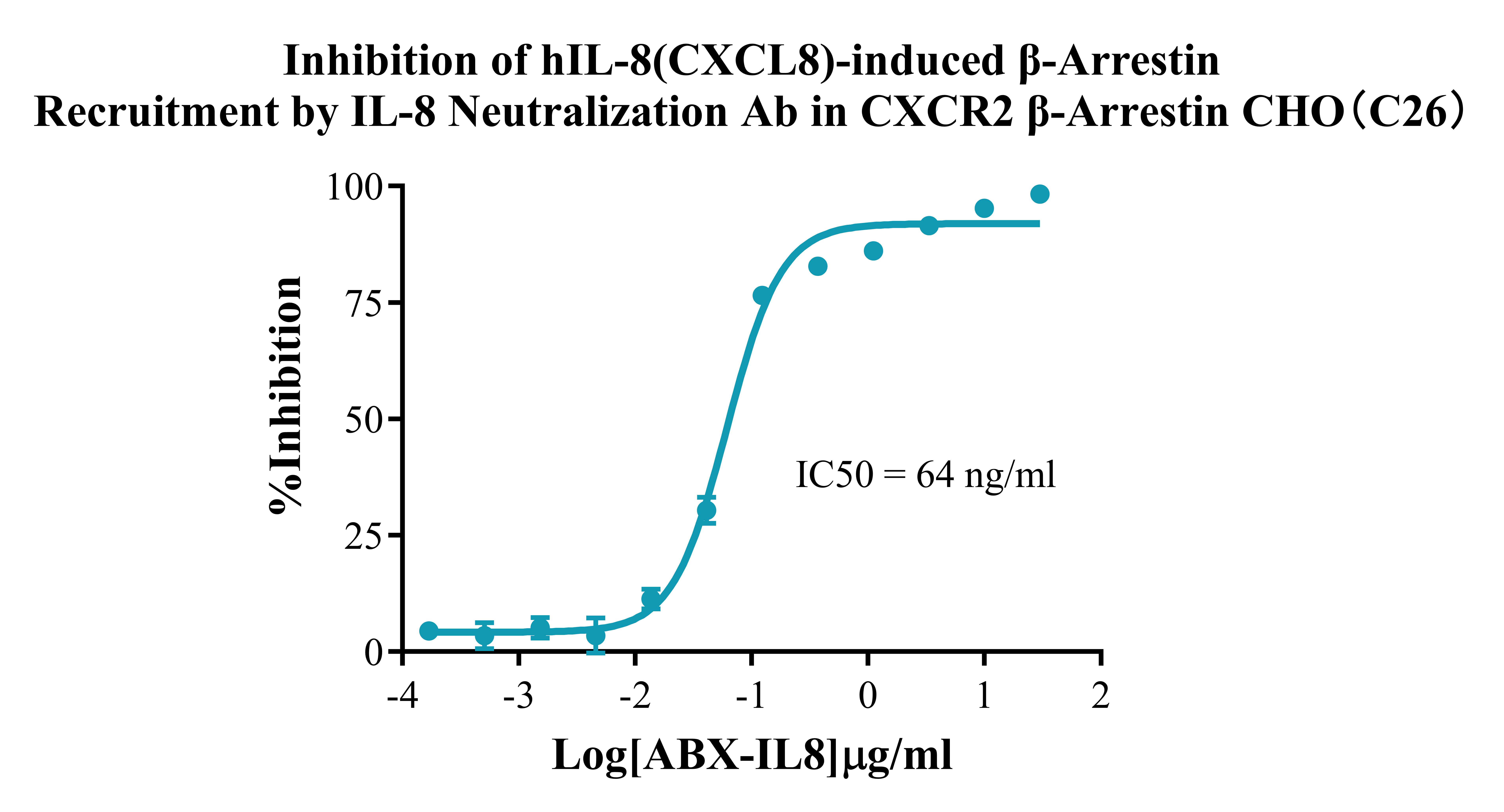 Figure 4.Inhibition of hlL-8(CXCL8)-induced β-Arrestin Recruitment by IL-8 Neutralization Ab in CXCR2 β-Arrestin CHO-K1 Cell(C26). |
