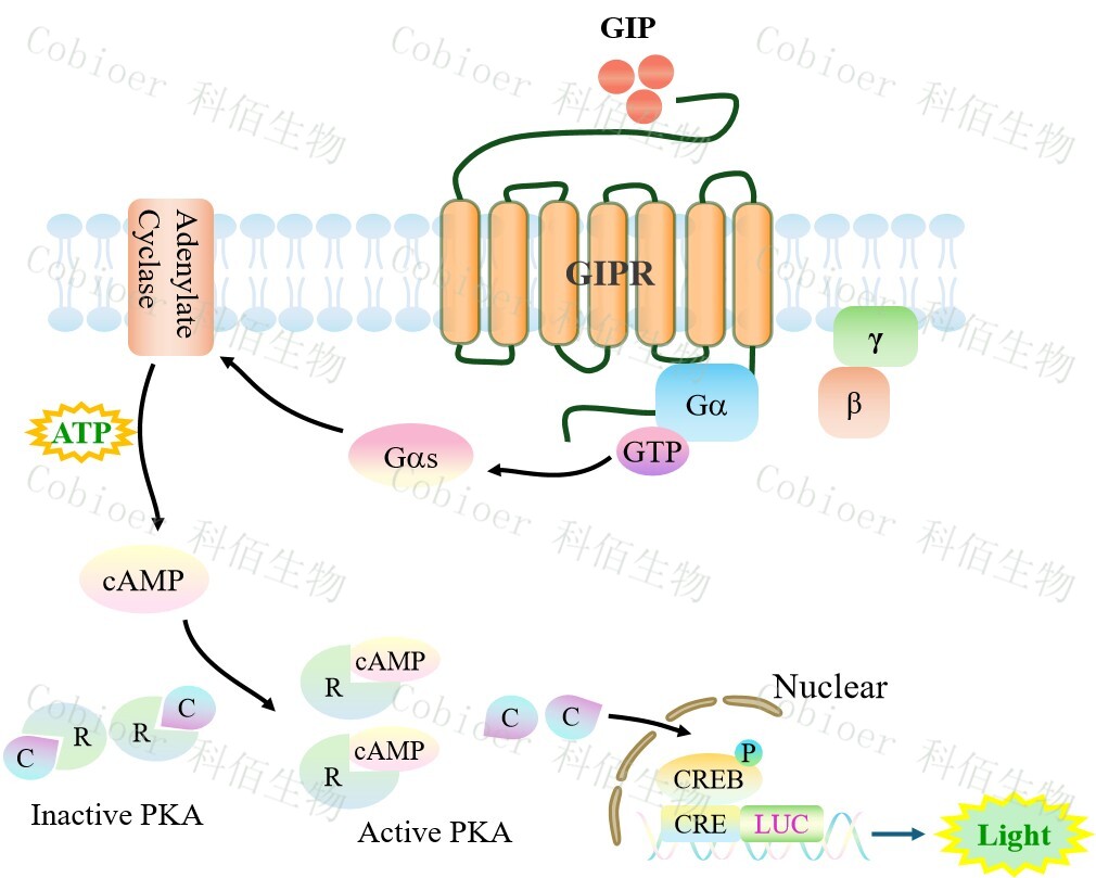 GIPR CRE-Luc HEK293 報告基因藥靶模型很好的模擬了體內 GIPR 的信號轉導過(guò)程, 原理見(jiàn)下圖所示。