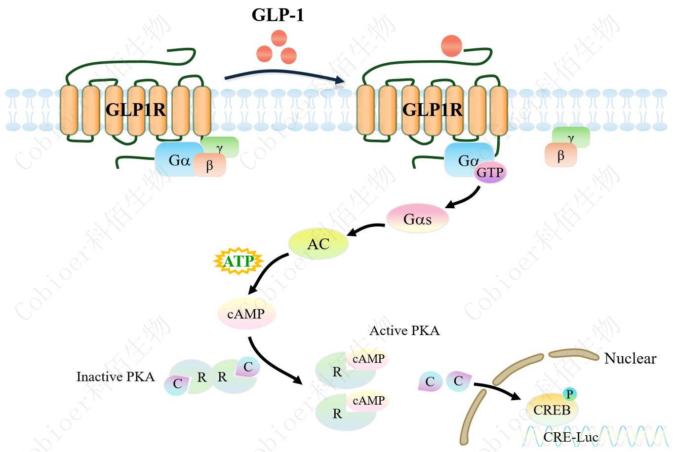 GLP1R CRE-Luc BHK 報告基因藥靶模型很好的模擬了體內 GLP1R 的信號轉導過(guò)程, 原理見(jiàn)下圖所示。