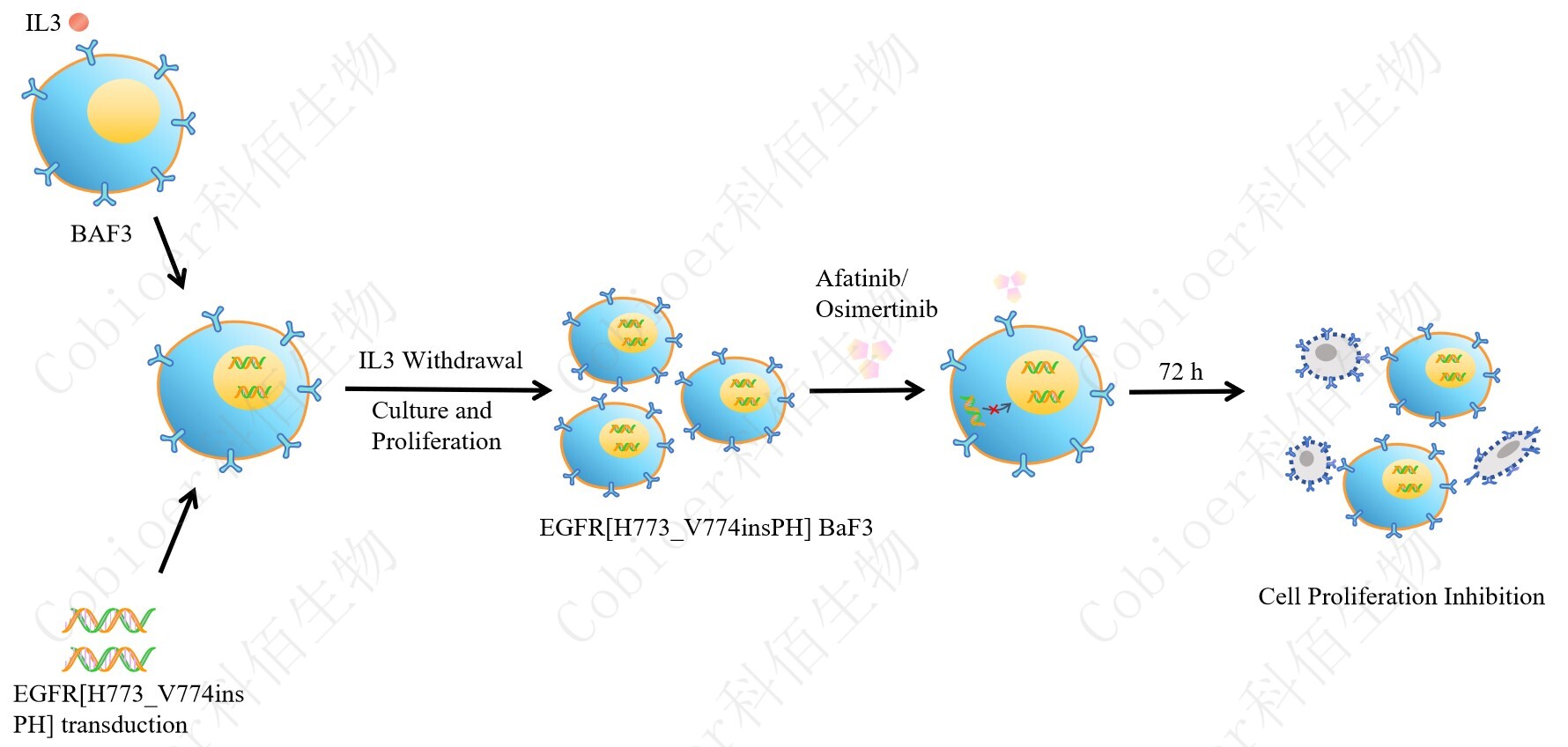 BaF3(小鼠原 B 細胞)的生長(cháng)和增殖需要 IL-3 的維持。通過(guò)引入各種表達激酶的基因, 能作為 BaF3 的驅動(dòng)基因,讓 BaF3 不再依賴(lài) IL-3 而增殖,進(jìn)而激酶基因成為 BaF3 增殖依 賴(lài)的驅動(dòng)基因,用于評估小分子藥物對激酶的靶向抑制作用,原理及流程見(jiàn)下圖所示。