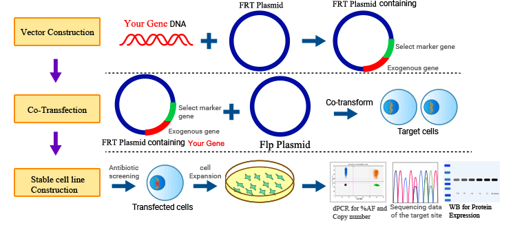 Flp-FRT整合系統是一種用于構建穩定細胞系的方法,該細胞系可在宿主細胞基因組的特定位置表達目的基因。該系統利用 Flp 重組酶和 FRT(Flp 重組靶位)位點(diǎn)實(shí)現位點(diǎn)特異性重組和整合。該系統可實(shí)現目的基因的穩定表達,確保細胞中蛋白質(zhì)的持續生產(chǎn)。