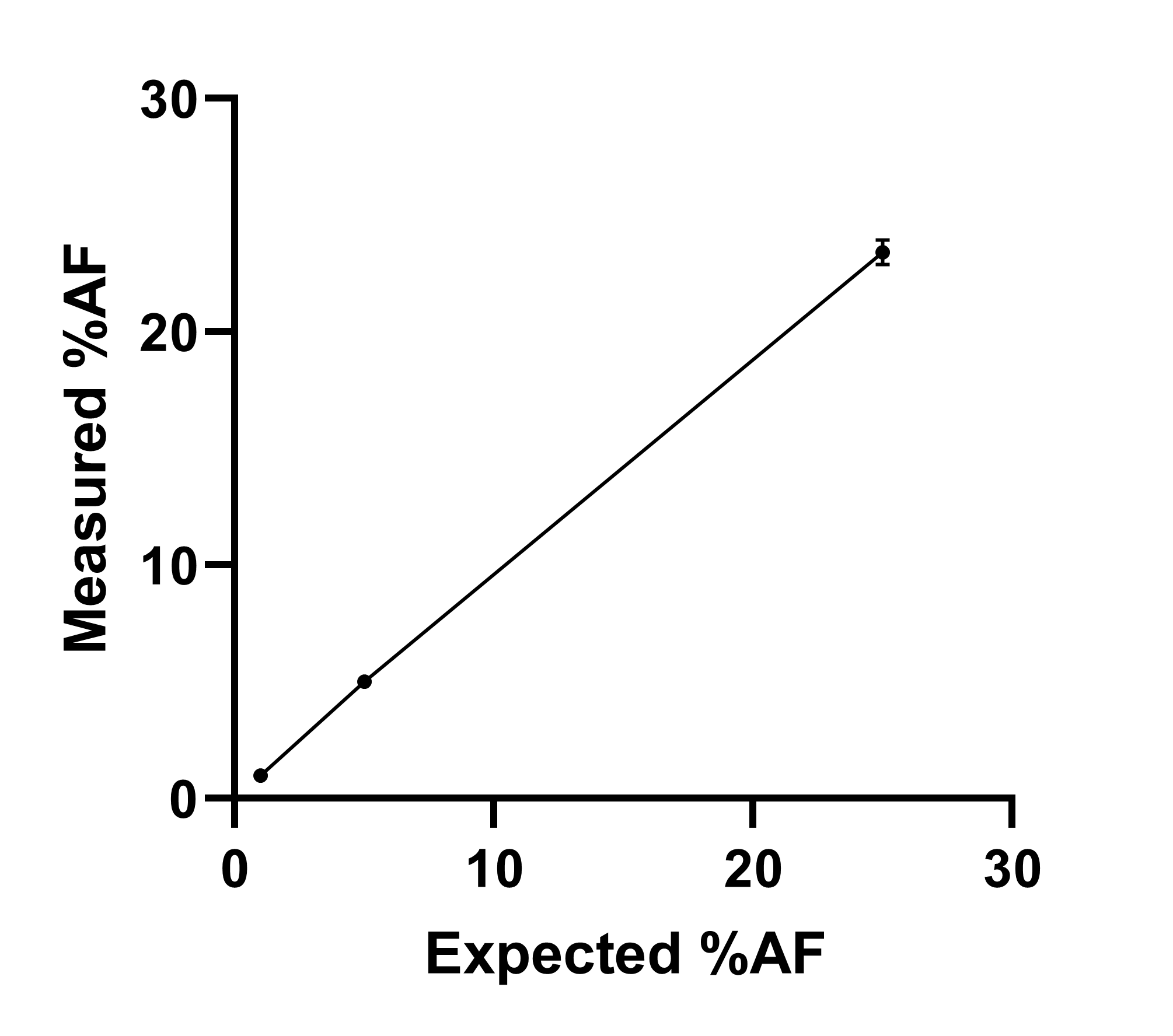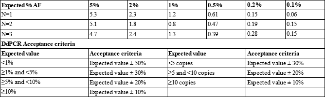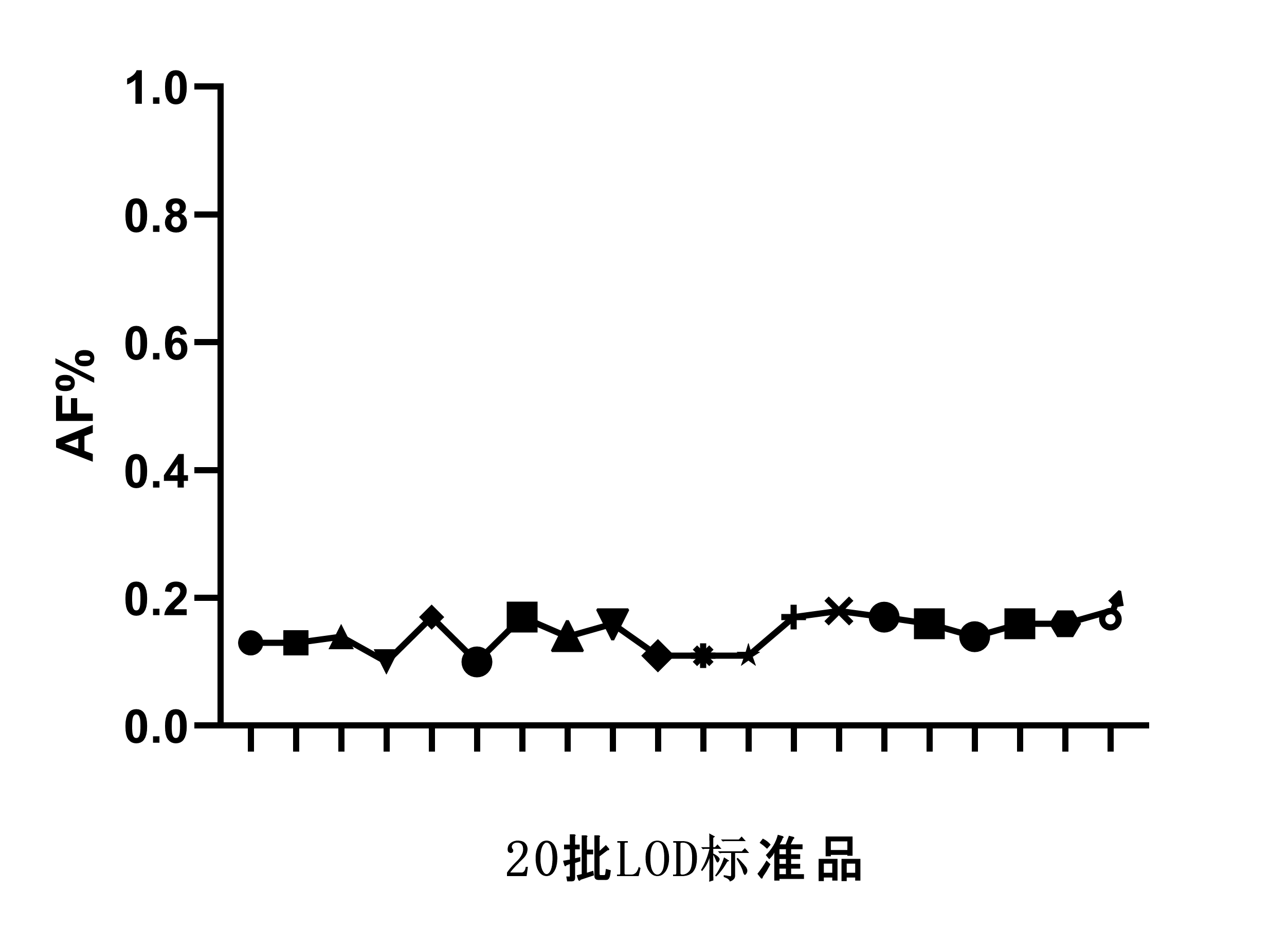 待測樣本:不同%AF的EGFR T790M的標準品,依次為5%,2%,1%,0.5%,0.2%,0.1%。