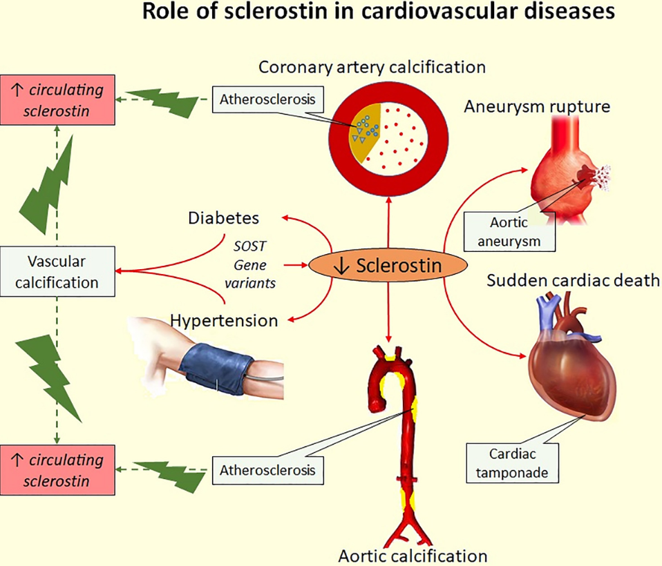 硬化蛋白在廣泛分布于心血管系統的VSMC (vascular smooth muscle cell, VSMC)中表達,并與許多血管疾病有關(guān)。動(dòng)物研究表明,在腹主動(dòng)脈瘤AAA、動(dòng)脈粥樣硬化和心臟破裂中存在硬化蛋白缺乏,并發(fā)現其在動(dòng)脈鈣化部位上調。有報告指出,導致動(dòng)脈硬化蛋白表達降低的基因變異增加了高血壓和糖尿病的患病率,并提高了心血管事件的風(fēng)險。
