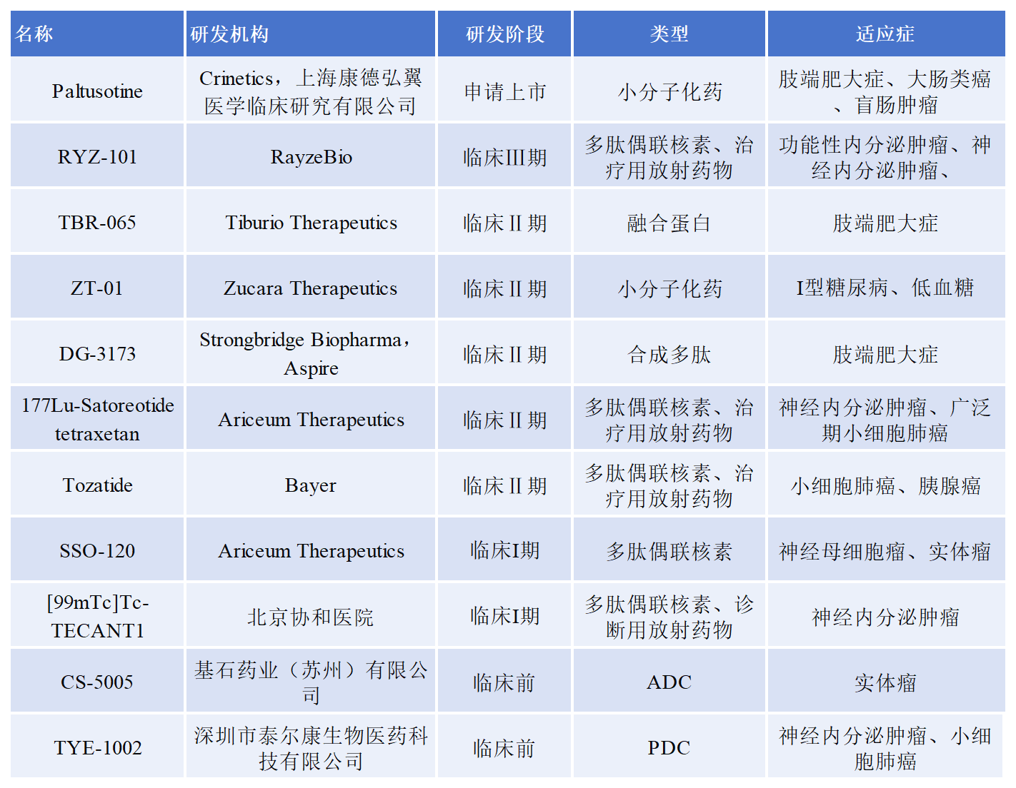 最近,賽諾菲獲得了Zucara Therapeutics公司靶向SSTR2的Ⅰ型糖尿病新藥ZT-01的優(yōu)先談判權。目前,關(guān)于SSTR2靶點(diǎn)有多種藥物在開(kāi)發(fā),部分在研藥物進(jìn)展如下: