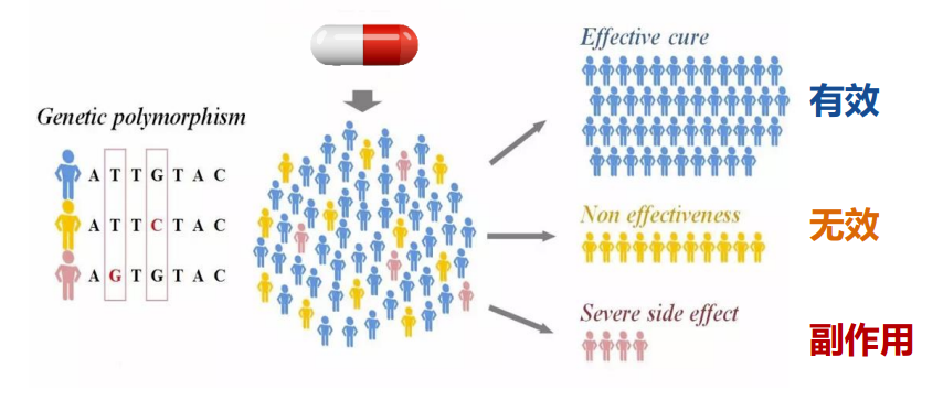 圖1:基因多態(tài)性導致藥物的個(gè)體化差異(相同病癥、相同藥物、相同劑量、不同藥效)