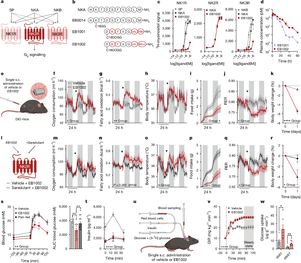 在文章研究部分,科研人員對肥胖模型小鼠注射了一種NK2R的天然配體激動(dòng)劑后發(fā)現這些肥胖小鼠體重在短期明顯下降,分析結果表明小鼠的能量消耗顯著(zhù)增加,食物攝入下降約20%,且該代謝效應并不依賴(lài)于瘦素(Leptin)信號通路。此外,科研人員發(fā)現優(yōu)化后的NK2R激動(dòng)劑EB1002不僅使小鼠在單次注射后的7天內體重持續下降約15%,還能提高小鼠對胰島素的敏感性,促進(jìn)白色脂肪組織攝取葡萄糖,且能激活下丘腦弓狀核和室旁核神經(jīng)元來(lái)抑制因瘦素或黑皮質(zhì)素4受體缺失引起的高食欲狀態(tài)。這個(gè)結果表明該靶點(diǎn)可能在抗肥胖領(lǐng)域中,遠比合并糖尿病的肥胖具有更廣泛的應用前景。