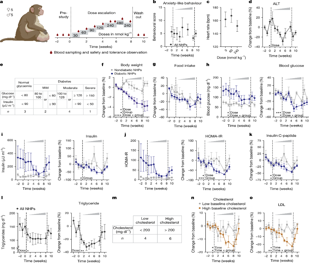 在患有心臟代謝疾病的肥胖的恒河猴中,NK2R激動(dòng)劑顯著(zhù)降低了體重、血糖、甘油三酯和膽固醇水平,并改善了胰島素抵抗,這些結果表明NK2R激動(dòng)劑在非人靈長(cháng)類(lèi)動(dòng)物中也具有潛在的治療潛力。