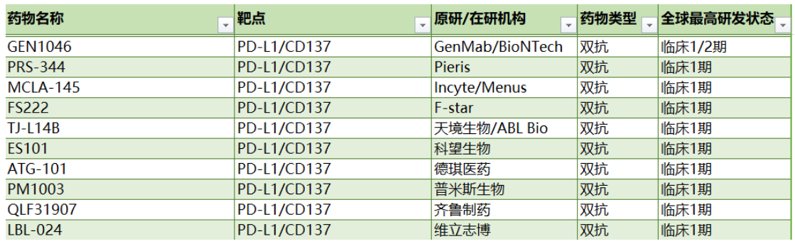 由于4-1BB在高度耗竭的PD-1高表達CD8+TIL上顯著(zhù)表達,并且在PD-1阻斷后進(jìn)一步上調,而4-1BB信號傳導則會(huì )誘導CD8+TIL的克隆擴增,CD8+TIL表現出腫瘤反應性而無(wú)終末分化,因此4-1BB和PD-L1可能是誘導T細胞抗腫瘤反應機制上的一對好搭檔。針對這兩者開(kāi)發(fā)雙特異性抗體是一種極具前景的開(kāi)發(fā)策略,引得國內外玩家紛紛參與,目前已有十余款針對PD-L1/4-1BB的雙抗藥物處于不同的研發(fā)介段,下表列舉了部分已進(jìn)入臨床的雙抗藥物: