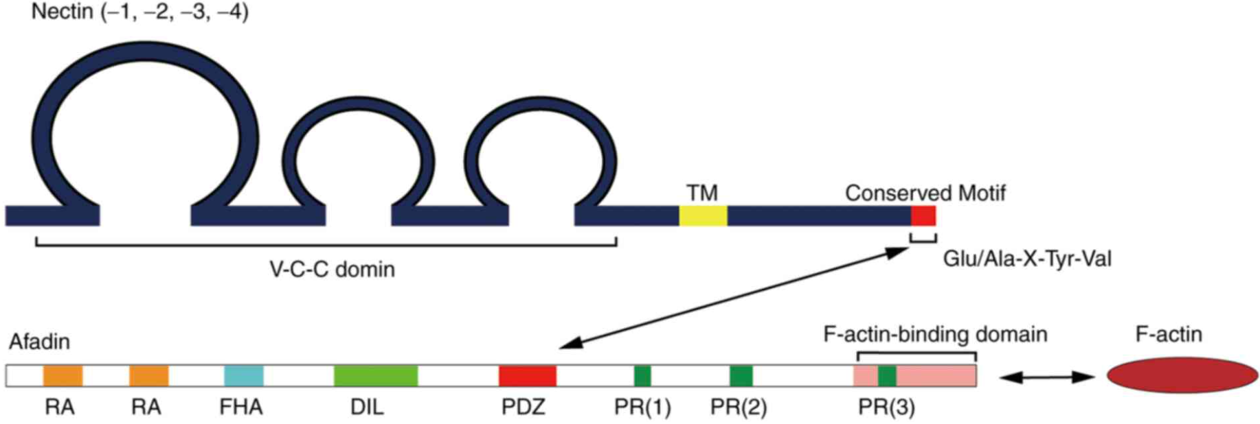 胞質(zhì)尾的C端都包含一個(gè)afadin (一種 F-肌動(dòng)蛋白結合蛋白)結合基序,與Nectin-4不同的是,Nectin-1、Nectin-2、Nectin-3的afadin結合基序都是保守序列 Glu/Ala-X-Tyr-Val,可與 afadin的PDZ 結構域結合;而Nectin-4可通過(guò)其C末端的 Gly-His-Leu-Val 基序與銜接分子afadin結合。當Nectins與銜接分子afadin結合后,afadin會(huì )結合并募集絲狀肌動(dòng)蛋白組件 (F-actin),從而促進(jìn)細胞與細胞之間的粘附。Nectin家族與鈣黏著(zhù)蛋白共同作用,對粘著(zhù)連接和緊密連接的產(chǎn)生和維持具有顯著(zhù)影響,它們調節多種細胞行為,包括細胞粘附、生長(cháng)、分化、遷移和凋亡。